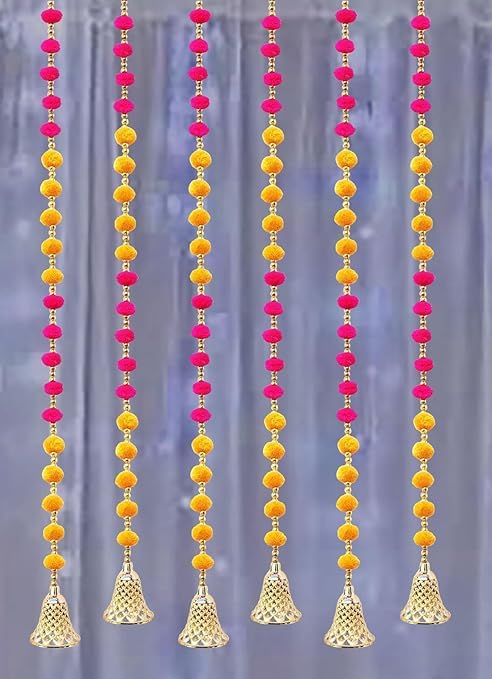 Indian Handmade Pom Pom Bead Toran for Decoration Long for Door Decoration Toran for Diwali/Ganpati/Navratri/Wedding/Festivals | 4Ft | 6 Strings Yellow Pink Golden Bell