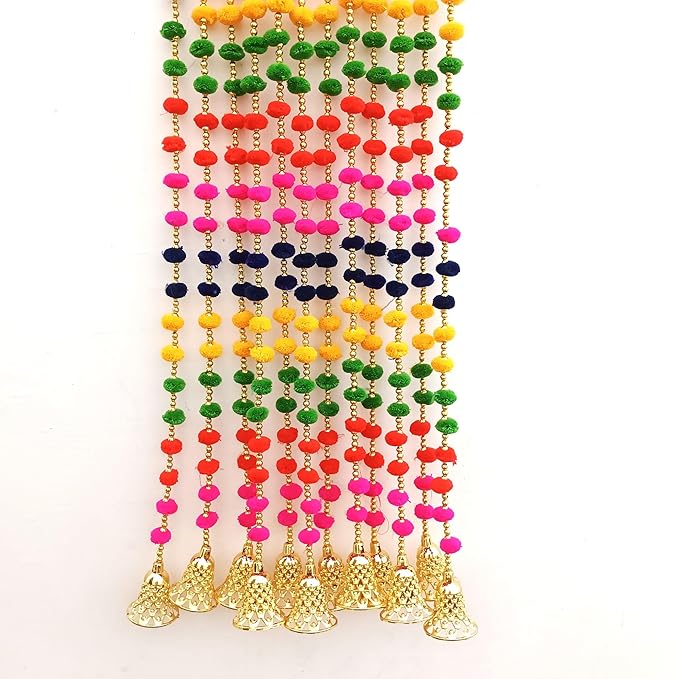 Colorful handmade pom pom bead toran (4 ft) with 6 hanging strings and golden bells, perfect for door decoration during Diwali, Ganpati, Navratri, weddings, and festivals.