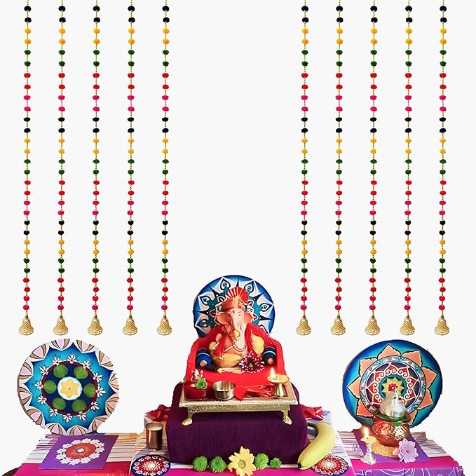 Bring vibrant festive charm to your home with this Indian Handmade Pom Pom Bead Toran (4 Ft). Designed with colorful pom poms, decorative beads, and golden bells, this beautiful door hanging adds a traditional and joyful touch to your home décor.