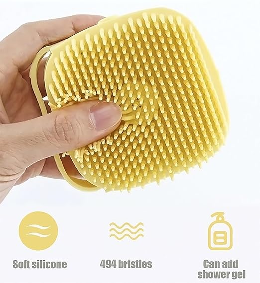 A soft silicone body brush with built-in shower gel dispenser, designed for gentle exfoliation and deep skin cleaning during bathing.