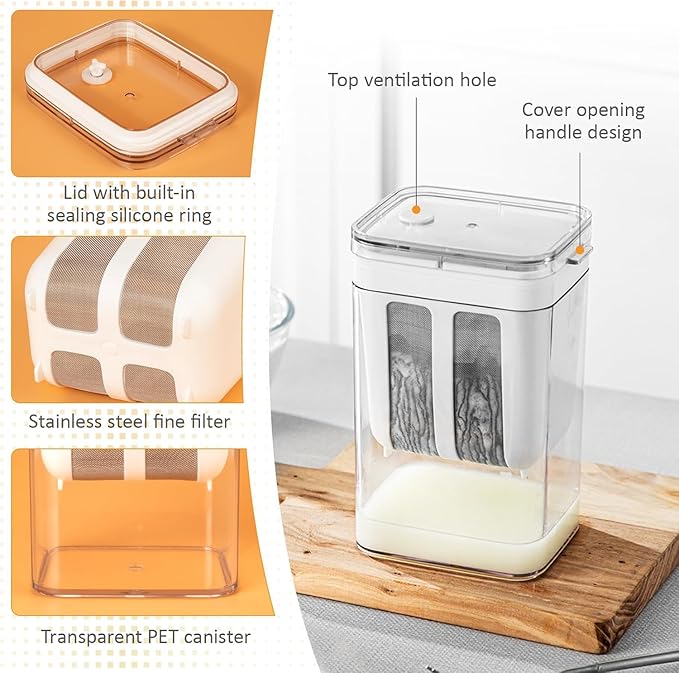 Made from durable, food-grade materials with a fine mesh filter, it ensures efficient straining while maintaining hygiene and quality. The compact design fits easily in most refrigerator shelves, making the process simple and convenient.